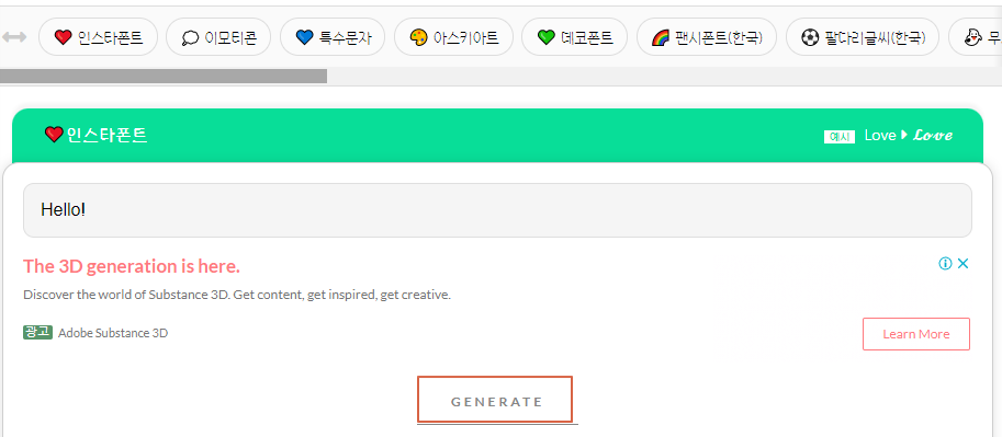 아래의 텍스트 창에 본인이 변환하고자 하는 텍스트를 입력하고 Generate 버튼을 누르면 곧바로 아래에 변환된 새로운 문자들이 나타나게 됩니다.