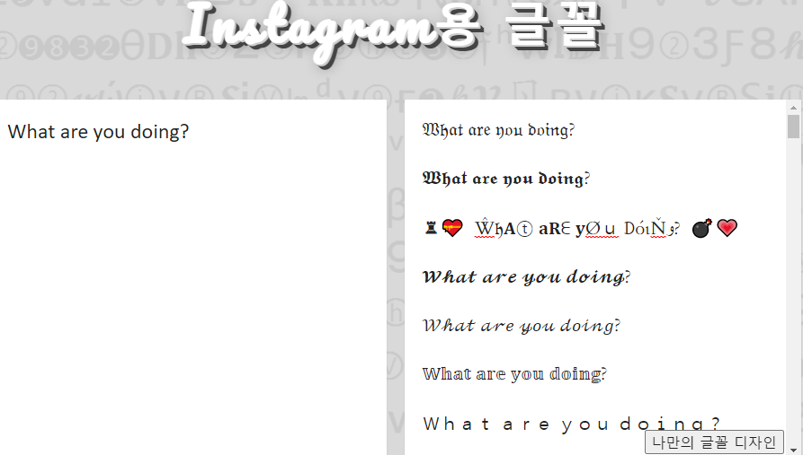 위와 같은 특수한 인스타 글씨체는 총 2가지 사이트를 통해 간단하게 인스타 글씨체 변환을 이용할 수 있습니다.
