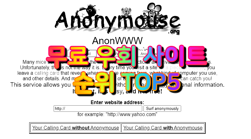 anonymouse.org사이트는 익명의 성격을 띠는 어나니머스를 본뜬 사이트로 본인이 원하는 사이트를 입력하면 웹프록시 우회를 통해 곧바로 사이트로 연결됩니다.
