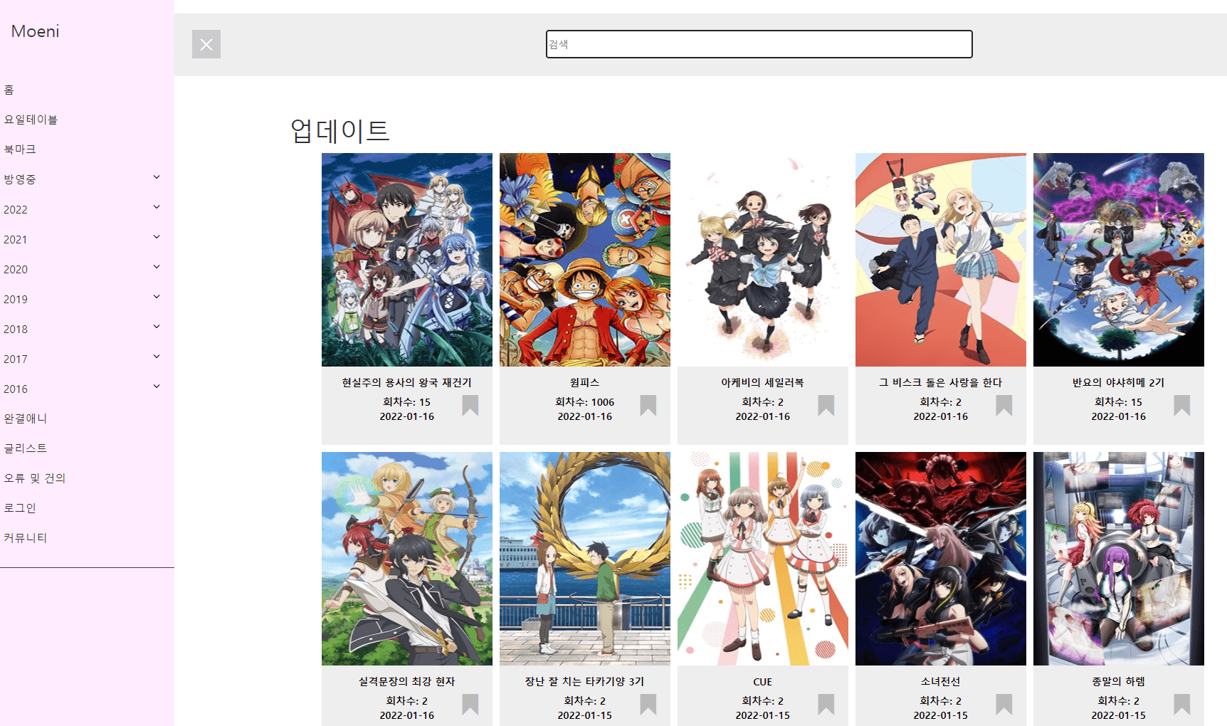 모에니 사이트는 상당히 간결한 유저 인터페이스가 가장 큰 특징이 될 것입니다. 모에니 사이트를 입장하면 곧바로 최신 업데이트 애니 목록이 제공되며 이는 최근 업데이트한 날짜, 회차수, 애니메이션 이름을 포함하여 실시간으로 업데이트되고 있습니다.