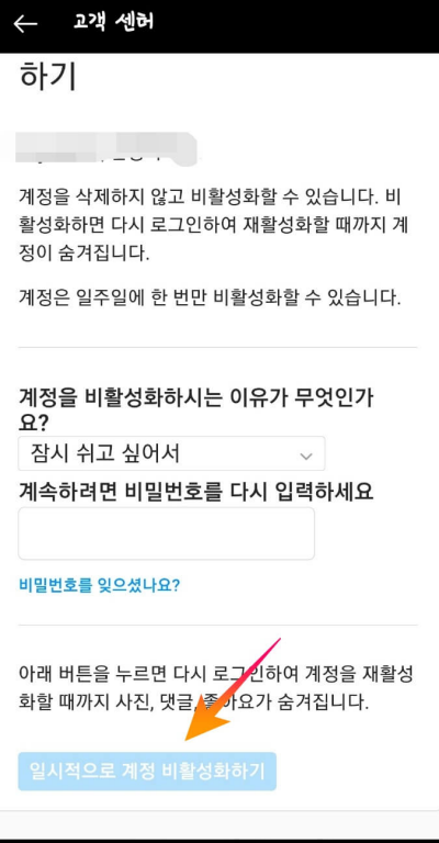 9. 계정 비활성화 이유 선택 및 비밀번호 입력 후 계정 임시 비활성화 클릭