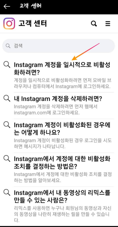 5.instagram 고객센터 - 검색 창 - 비활성화 검색 - 최상단 글 클릭