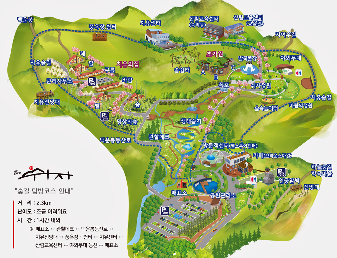 백운봉을 끼고 드넓은 쉼터와 등산로, 명상의 숲 ,치유의 집등 다양하게 정말로 현대인들이 쉴 수 있는 숲길 코스를 마련해두었다.