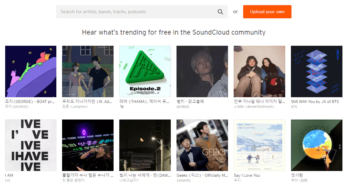 최신 트렌드 음악 파일 뿐만 아니라 개인 음원 파일까지 공유할 수 있는 사운드 클라우드에서는 인기 있는 최신 음악 리스트를 한 눈에 파악할 수 있습니다.