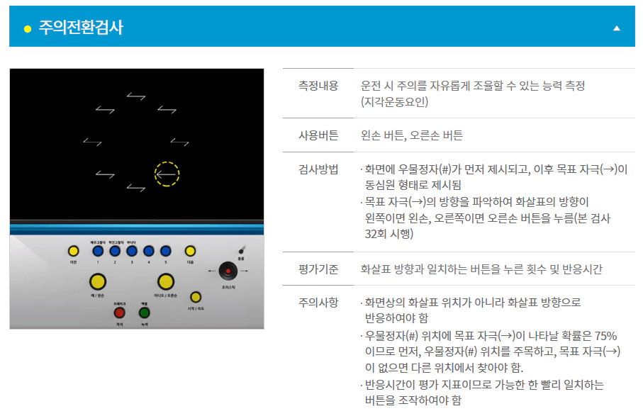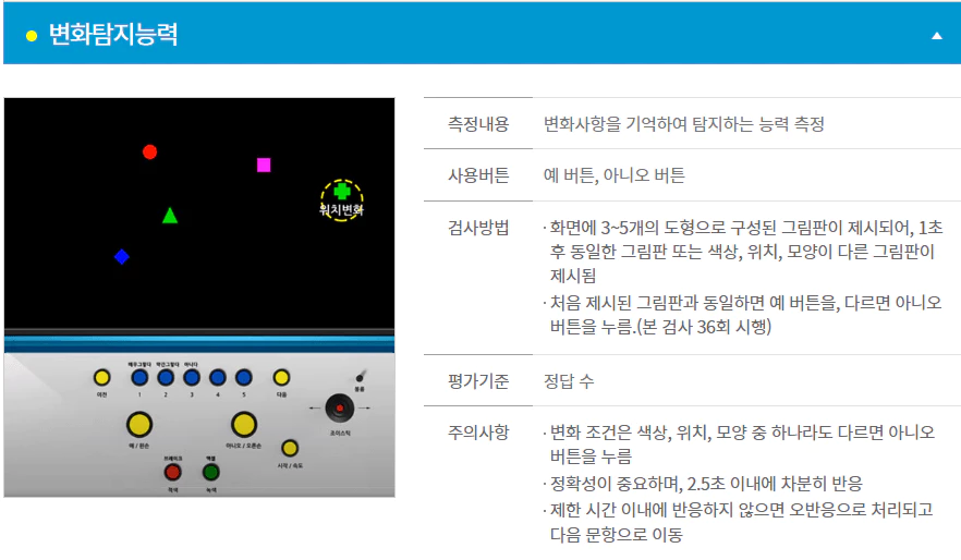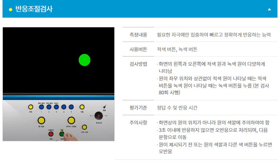 반응조절 검사는 해당 색에 맞추어 버튼을 누르면 되는데 양 손모두 버튼에 올리고 바로 선택하는 것이 좋습니다.