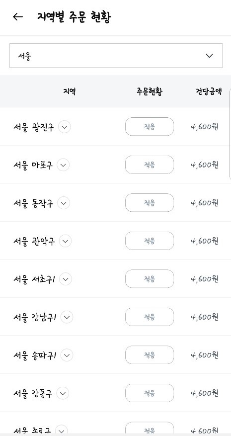 주문예상지역에 들어가보시면 사진과 같이 주문량이 많은 지역을 파악할 수 있고, 본인이 살고 있는 곳이 주문량이 얼마나 많은 가를 파악할 수 있습니다.
