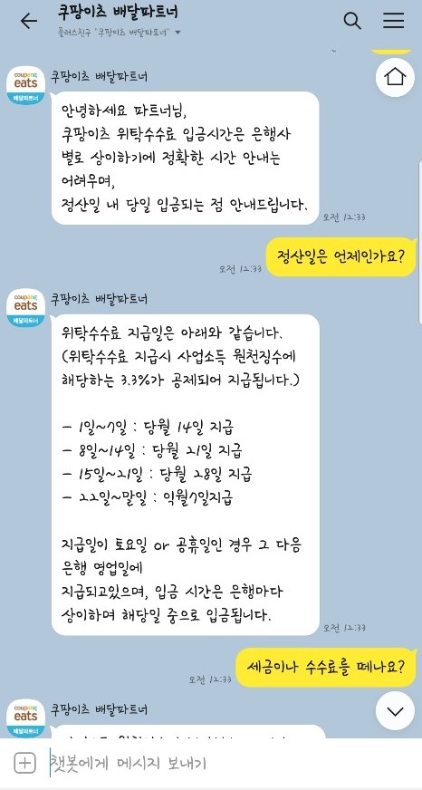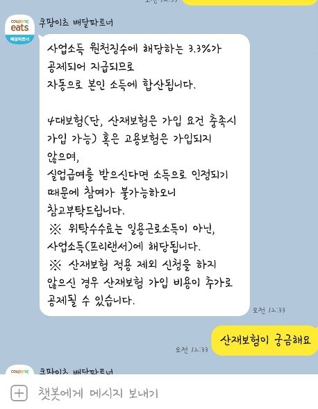 챗봇을 통해 보험에 대해 질문해보니 3.3%는 기본적으로 공제되며 4대보험 및 고용보험은 따로 가입되지 않아 배민커넥트와 달리 보험료를 내지 않아도되나, 사고 시 보험처리를 할 수 없답니다.