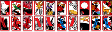 1월 : 송학, 2월 : 매조, 3월 : 벚꽃, 4월 : 흑싸리, 5월 : 난초