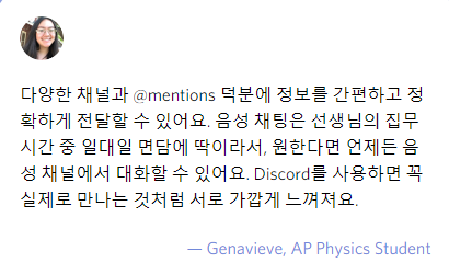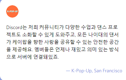 Discord는 모두가 살면서 자신만의 자리를 찾을 수 있기를 바라는 마음에서 만들어졌답니다. 여러분이 저희를 통해 주변의 소중한 사람들과 더 쉽게 소통하게 되기를 바랍니다. 그리고 전 세계의, 그리고 바로 가까이 있는 친구들, 커뮤니티와 더욱 깊은 관계가 되기를 바랍니다. 독창, 신뢰, 명랑, 공감은 Discord의 직원과 사용자 여러분을 연결해 주는 네 가지 단어입니다.
