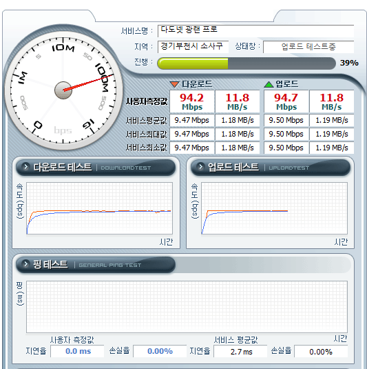 이를 통해 제가 신청한 인터넷 속도만큼 거의 손실없이 인터넷을 사용하고 있음을 알 수 있습니다.