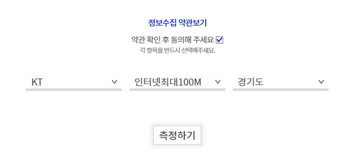 다운로드 및 설치 완료 후 다시 사이트에서 본인의 상황에 맞는 사용중인 인터넷과 지역을 눌러 측정하기 버튼을 눌러 측정을 진행합니다.