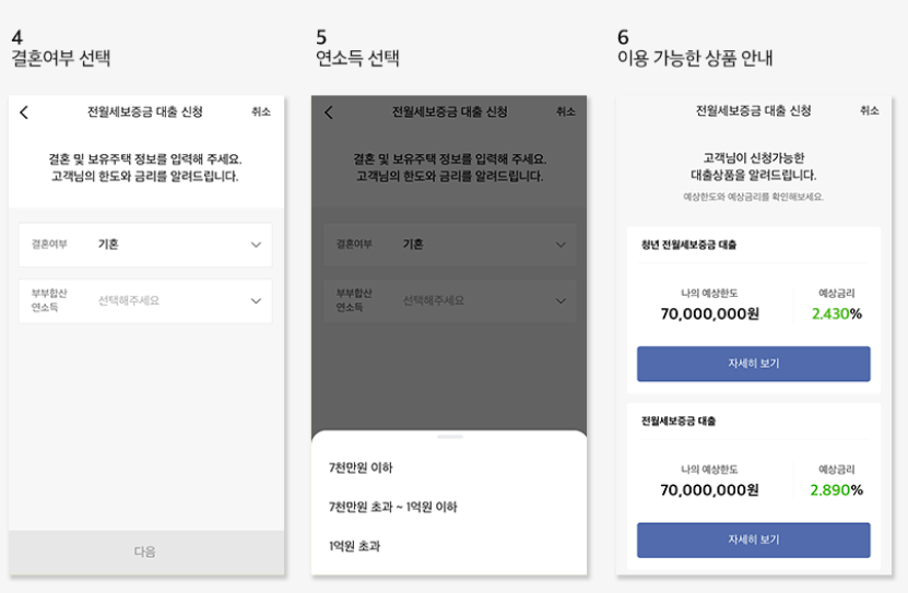 대출한도금액 : 최대한도 7,000만원 이내에서 90% 대출 가능 만약 보증금이 7,000만원이면 90%에 해당하는 6,300만원이 대출되게 되며, 1억원인 경우에는 최대치인 7,000만원을 대출 받을 수 있음.