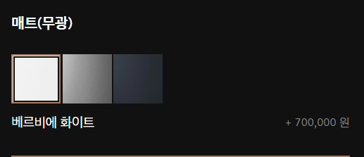 매트 화이트부터 블랙까지 추가금 70만원을 추가하면 매트색상으로 변경할 수 있습니다.