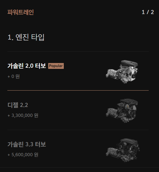 맨 왼쪽부터 1998cc인 가솔린 2.0터보는 기본구성으로 추가금이 없습니다. 최대토크가 36kg.m여서 차량이 치고 나간다는 느낌을 강하게 받기는 어렵지만 시내 주행을 주로 하신다면 나쁘지 않은 선택입니다.