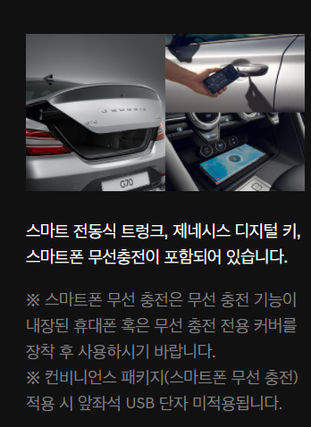 컨비니언스 패키지는 무선충전 기능 및 디지털 키와 전동식 트렁크를 포함하고 있어 편리성에 상당히 많은 도움을 줄 것으로 보입니다.