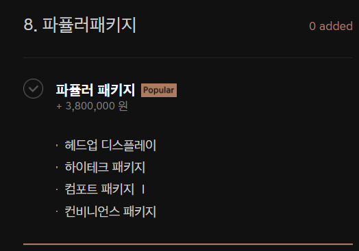 옵션에서 바로 만나볼 수 있는 파퓰러 패키지는 기본적으로 헤드업 디스플레이 + 하이테크 패키지 + 컴포트 패키지 I + 컨비니언스 패키지를 포함하고 있습니다.