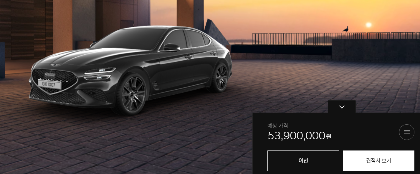 만약 2021 제네시스 G70을 구매한다면 선택할 옵션들과 개인적인 취향을 더해 최종적으로 산출된 가격은 5,390만원입니다.