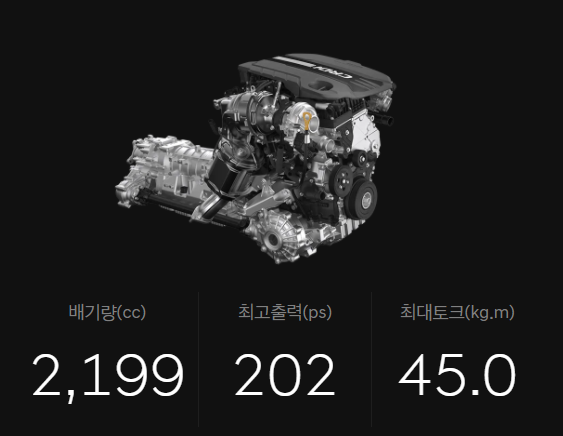 디젤 2.2은 디젤이니 만큼 배기량은 2,199에도 불구하고 토그가 45kg.m까지 상승합니다. 연비도 잡을 수 있고 최근 기술력으로는 디젤도 우수한 정숙성을 뽐내고 있어 많이들 선택하고 있는 추세입니다. 가격은 + 330만원입니다.