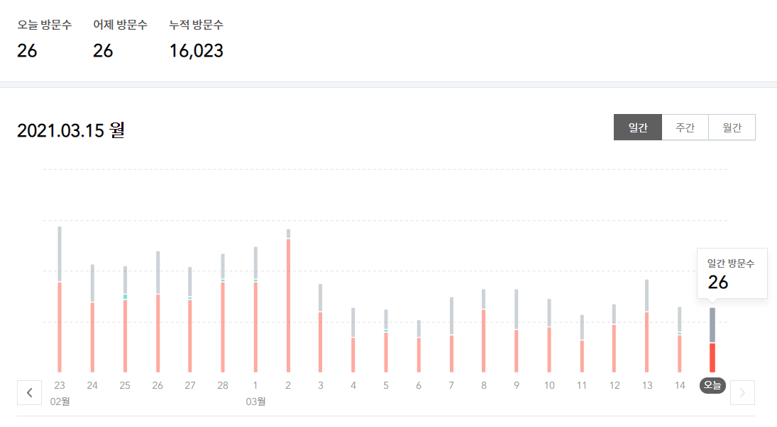 20$대에 안착한 후 글을 쓰는 빈도는 일주일에 2~3개 정도를 작성하고 있으며 종종 게릴라를 통한 유입을 유지시키고 있습니다.