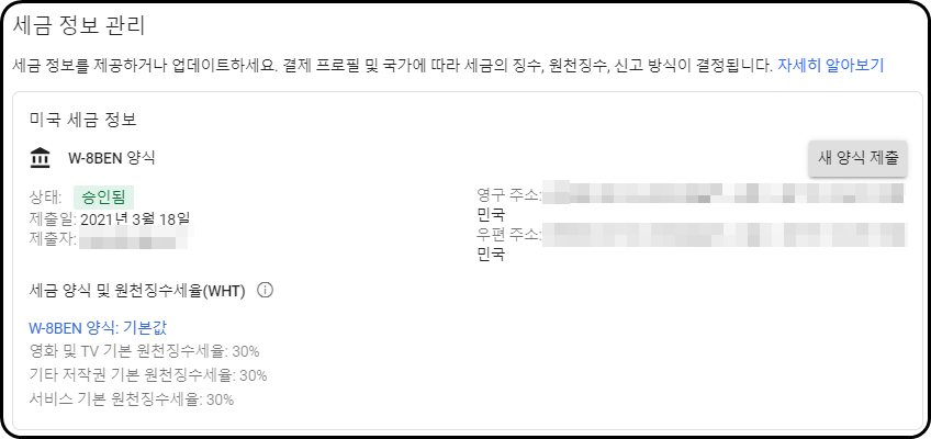 (대부분의 경우 대한민국에서 수익을 창출하고 계시니 세금정보를 제출하신다면 세금을 제하지 않습니다.)