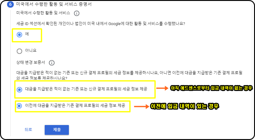 애드센스로부터 입금을 받은 내역이 있을 경우 상단, 없으며 하단을 체크 한후 제출해주시면 됩니다.