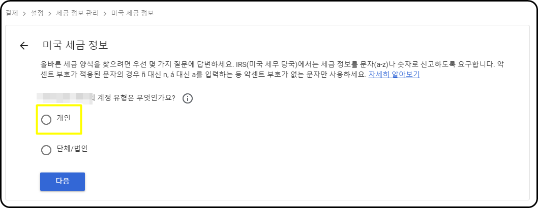 5.세금 계정 유형은 개인이므로 개인을 체크하고 다음