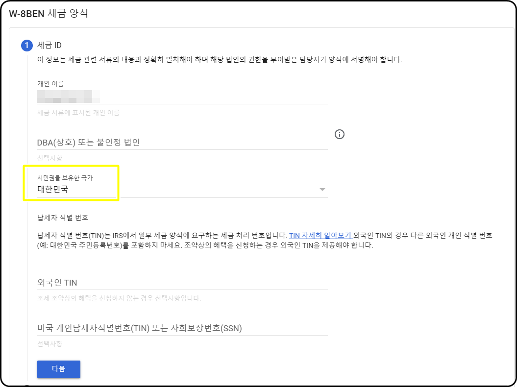 7.W-8BEN세금 양식에서 시민권 국가는 대한민국을 선택한 후 다음.