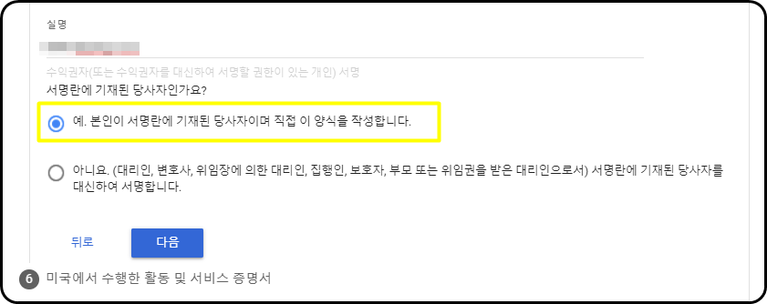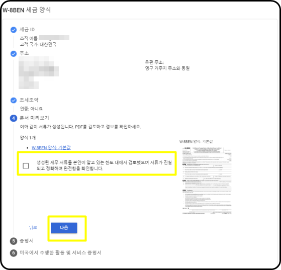 10.W-8BEN세금 양식에서 서류를 확인 후 체크, 그리고 다음버튼을 눌러줍니다.