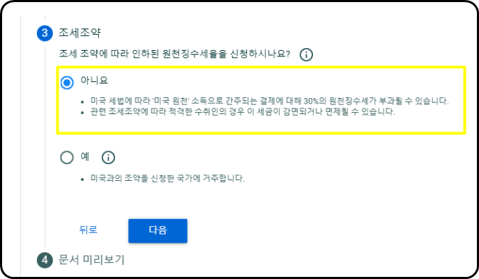 아니요를 선택하시면 미국 내에서 발생하는 수익의 30%가 세금으로 부과되며, 국내에서 수익을 발생시키고 계신분들께는 해당이 되지 않습니다. (만약 미국 트래픽이 많으시다면 미국 사업자 신청 후 '예"를 택하셔야합니다)
