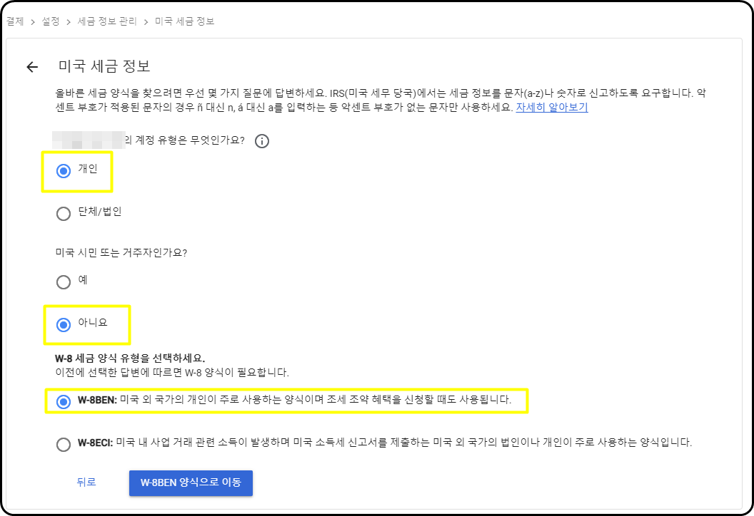 6.미국 시민 또는 거주지인가요?? - 아니요, W-8세금 양식 유형은 W-8BEN을 선택합니다.