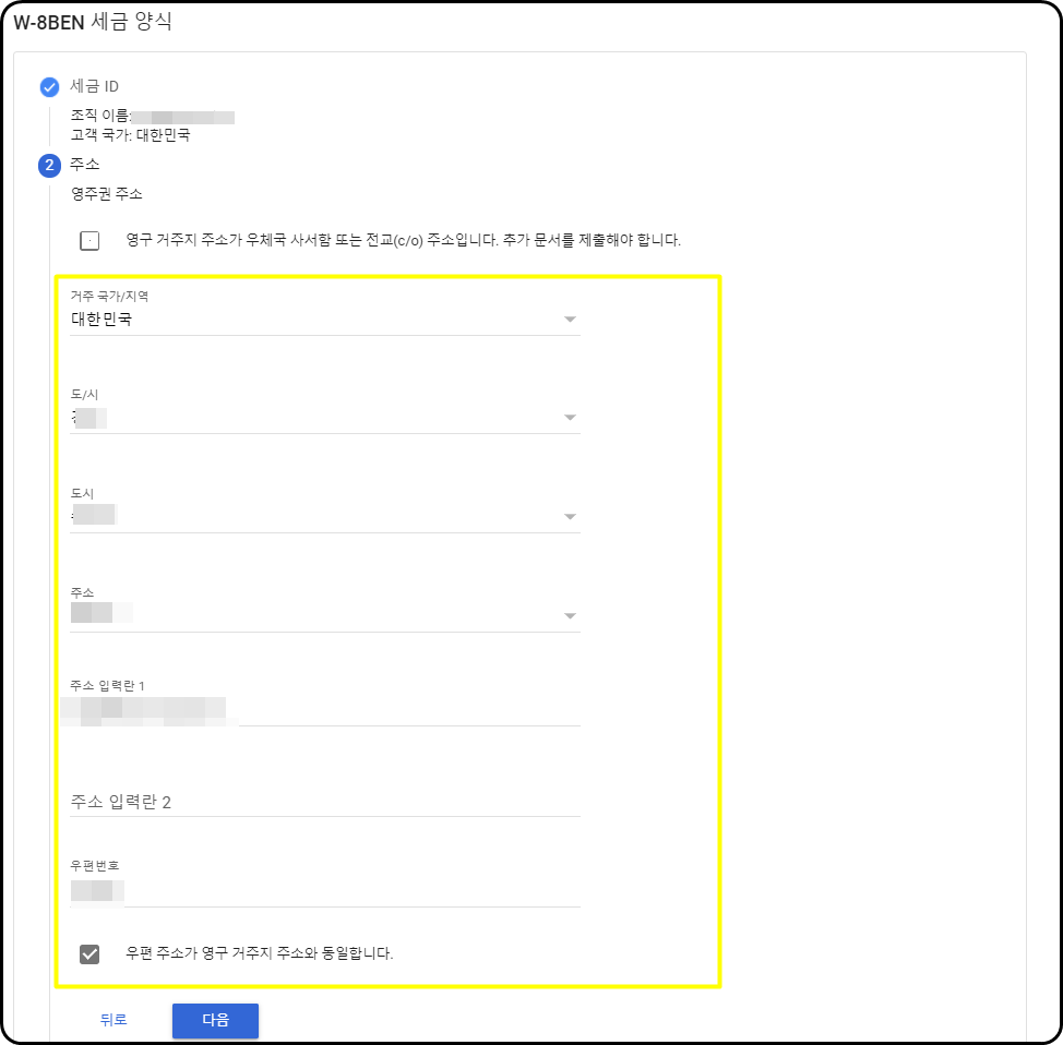 8.본인의 주소지와 우편번호를 입력한 후 다음.
