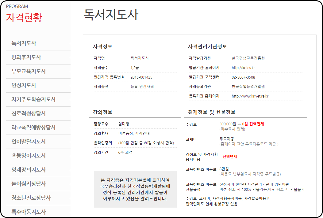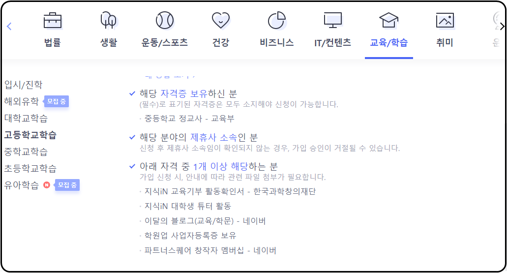 교육/학습 분야에서는 중등학교 정교사로 교사여야만 자격증으로 인정되어 활동이 가능합니다.