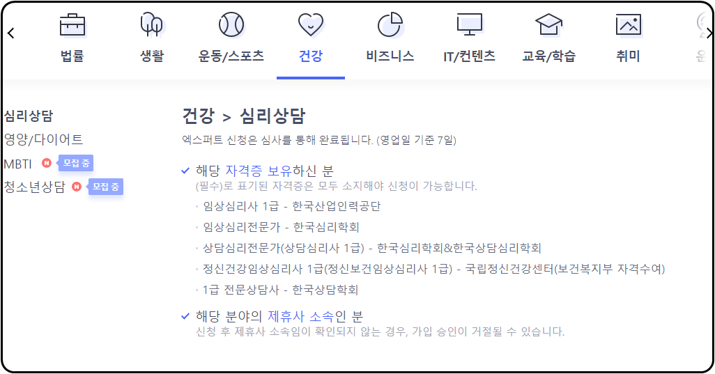 각 지식iN 엑스퍼트 분야별로 요구하는 자격이 있답니다.