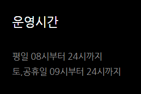 평일 08시~24시, 주말 09시~24시까지 운영중입니다.