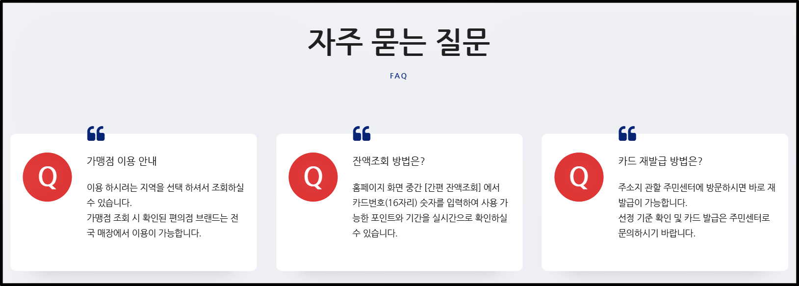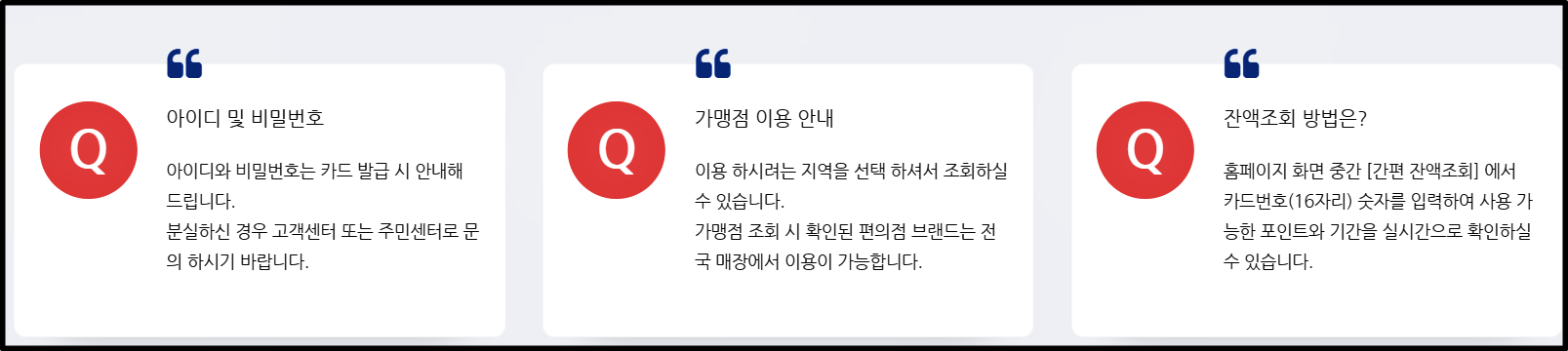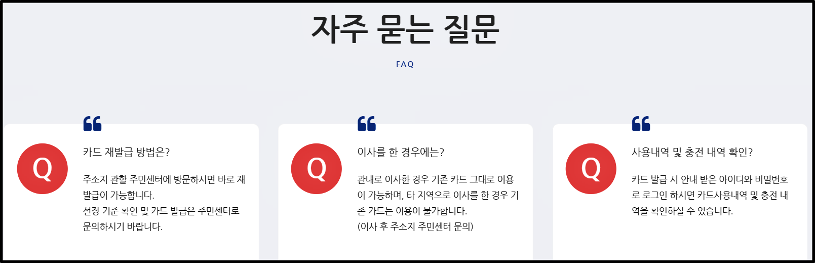 자주묻는 질문으로는 가맹점이용과 잔액조회 방법, 카드 재발급 방법, 이사를 한 경우, 사용 내역 및 충전확인, 아이디 및 비밀번호 찾기에 대한 답변들이 나와있으니 참고하시길 바랍니다.
