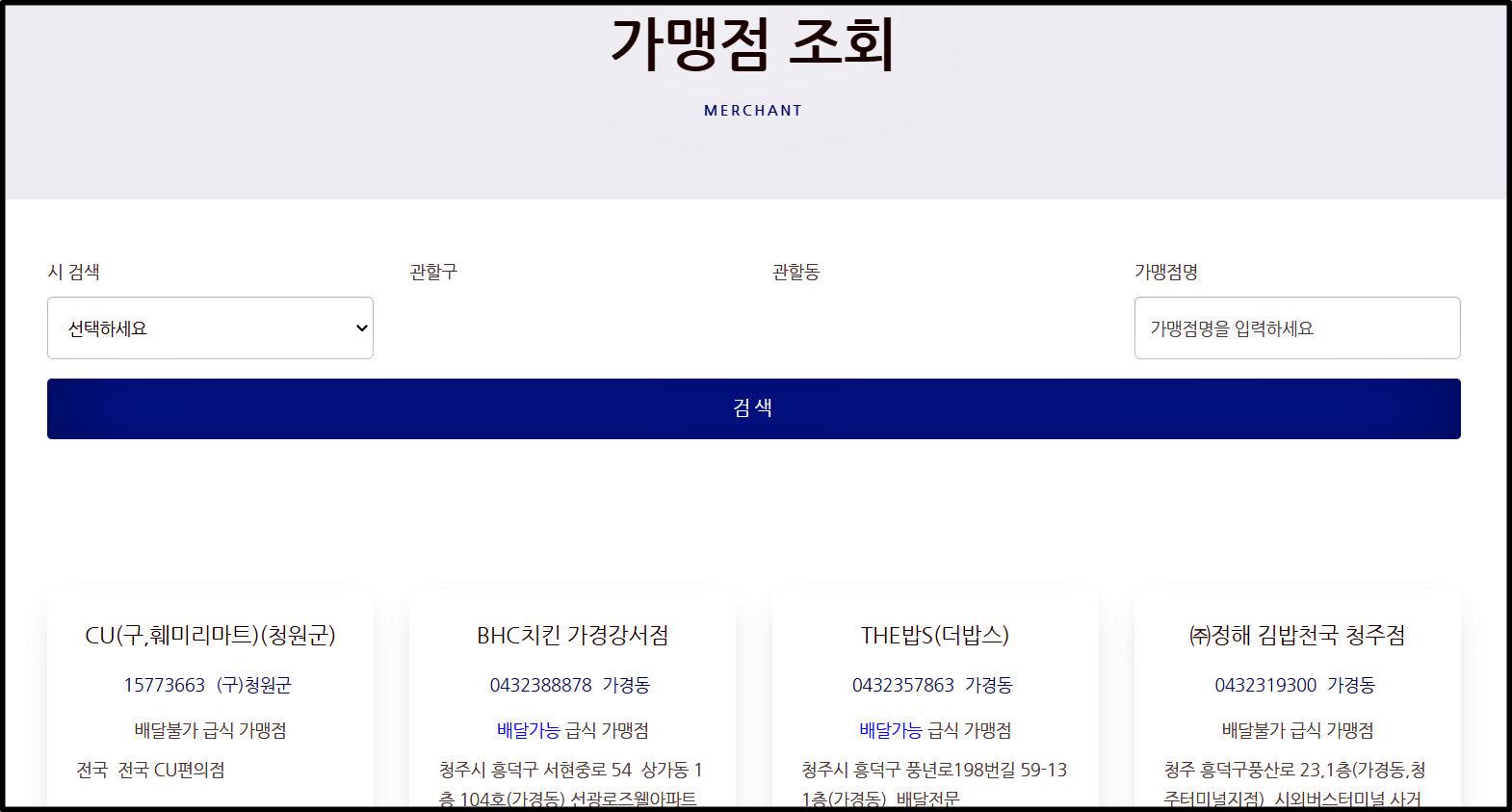 또한 우측 상단에 있는 가맹점 조회를 통해 본인이 거주하고 있는 근방에 어떤 가맹점이 있는지 편리하게 검색할 수 있으니 가맹점 조회도 한번 이용해 보시길 바랍니다.