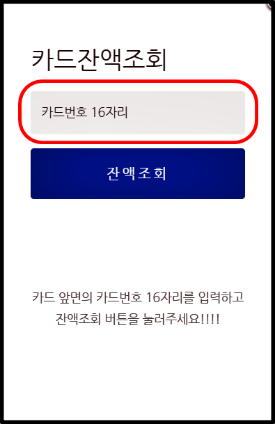 카드잔액조회를 클릭하면 아래 사진과 같이 카드번호 16자리를 입력하게 됩니다.