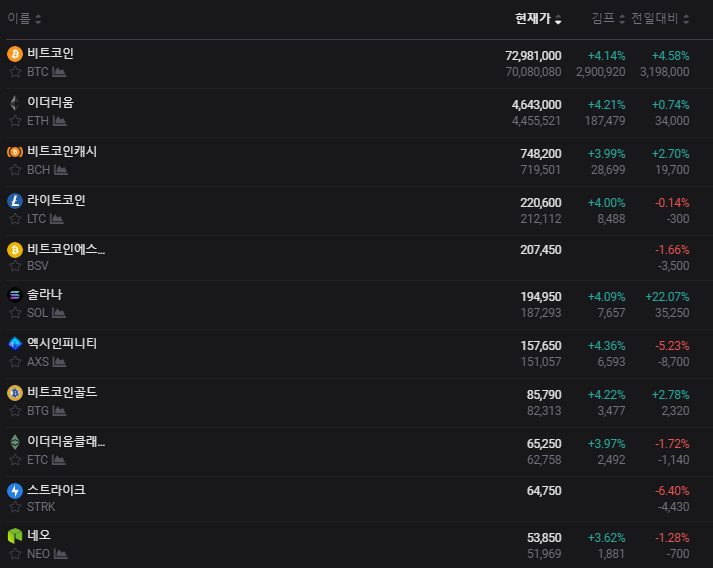 또한, 이름 순 현재가 순, 김프 순, 전일대비 순, 거래액 순으로 실시간으로 확인할 수 있다는 장점이 있습니다